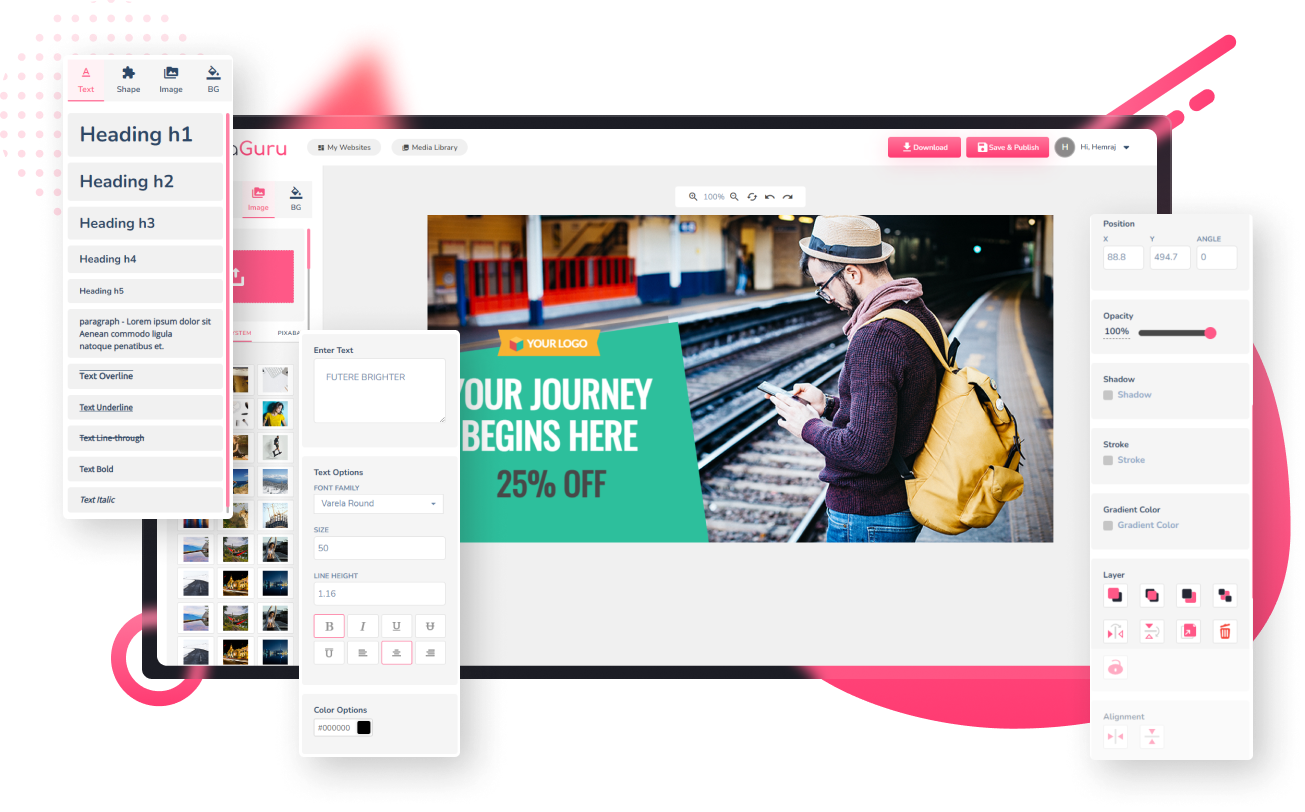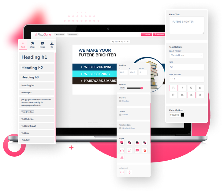 Pixaguru Editor Offers A Variety Of Typography Options To Customize Headings, Paragraphs, And Other Elements With Font Style, Color, Size, And Line Height. You Can Also Add Gradients, Strokes, And Shadows To Make Your Text Stand Out And Captivate Readers. With Typography, You Can Create Engaging And Impactful Content.