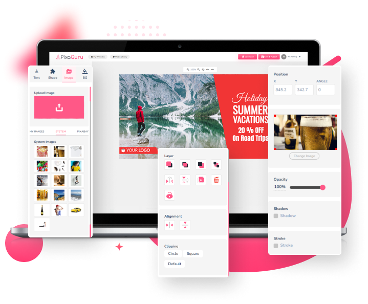 Pixaguru's Image Option Tool Lets You Upload Your Own Images And Access A Massive Library, Including Pixabay Integration For More Options. You Can Crop, Resize, And Add Special Effects Like Opacity, Shadow, And Stroke. Create Stunning Visuals That Leave Your Audience In Awe With Endless Possibilities Using Pixaguru's Image Options.